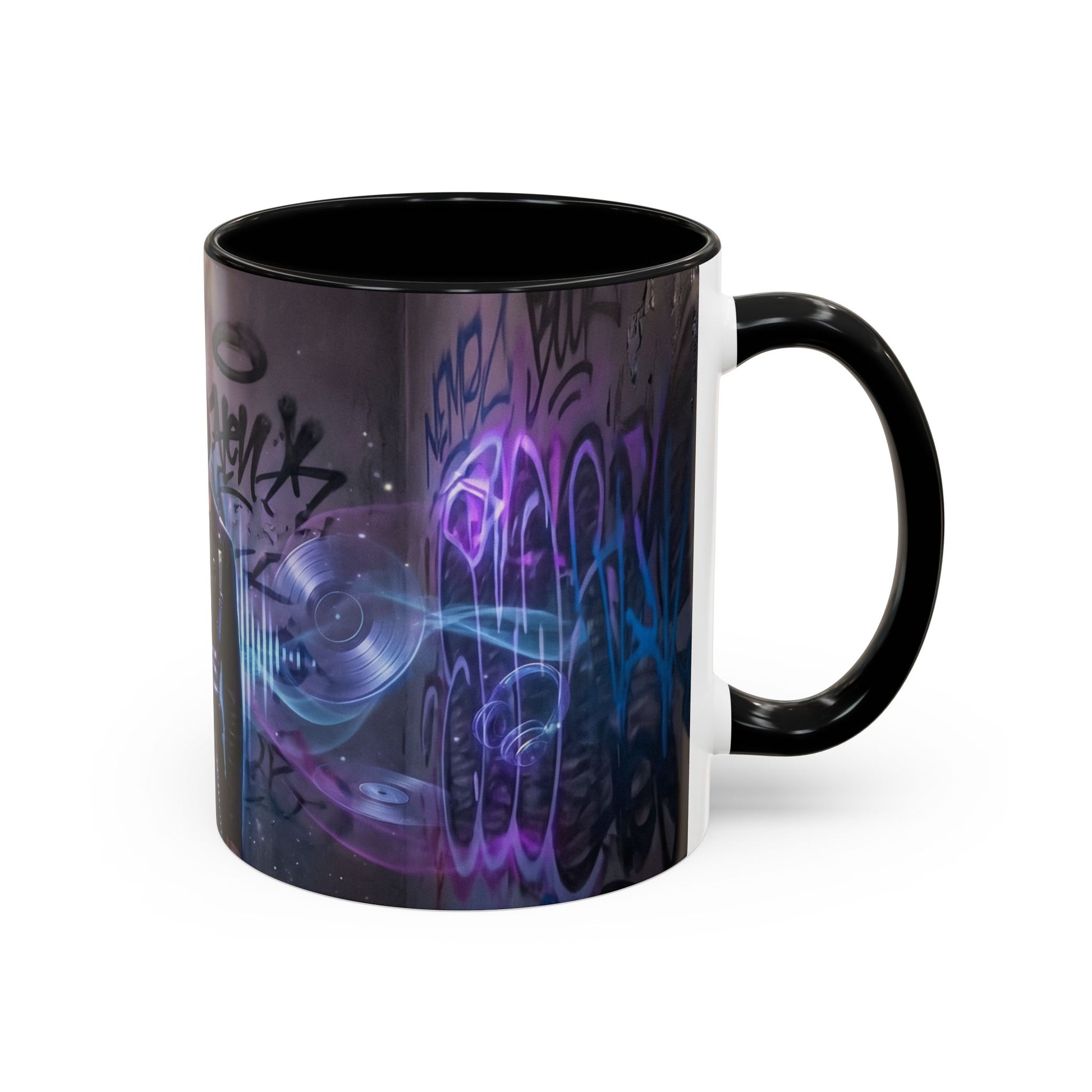 A semi-realistic, edgy scene set in a graffiti-covered bathroom, walls layered with colorful tags, street art, and urban textures. In the center stands a confident woman dressed in techno-inspired fashion: sleek, black minimal clothing with bold silhouettes, mesh, leather, and avant-garde details.. The black interior and handle add a crisp frame to the art, making each pause feel intentional. It’s for those who savor stillness with their coffee, tea, or cocoa — a small ritual object that nudges you back to peace between busy moments and makes slow mornings feel sacred.
