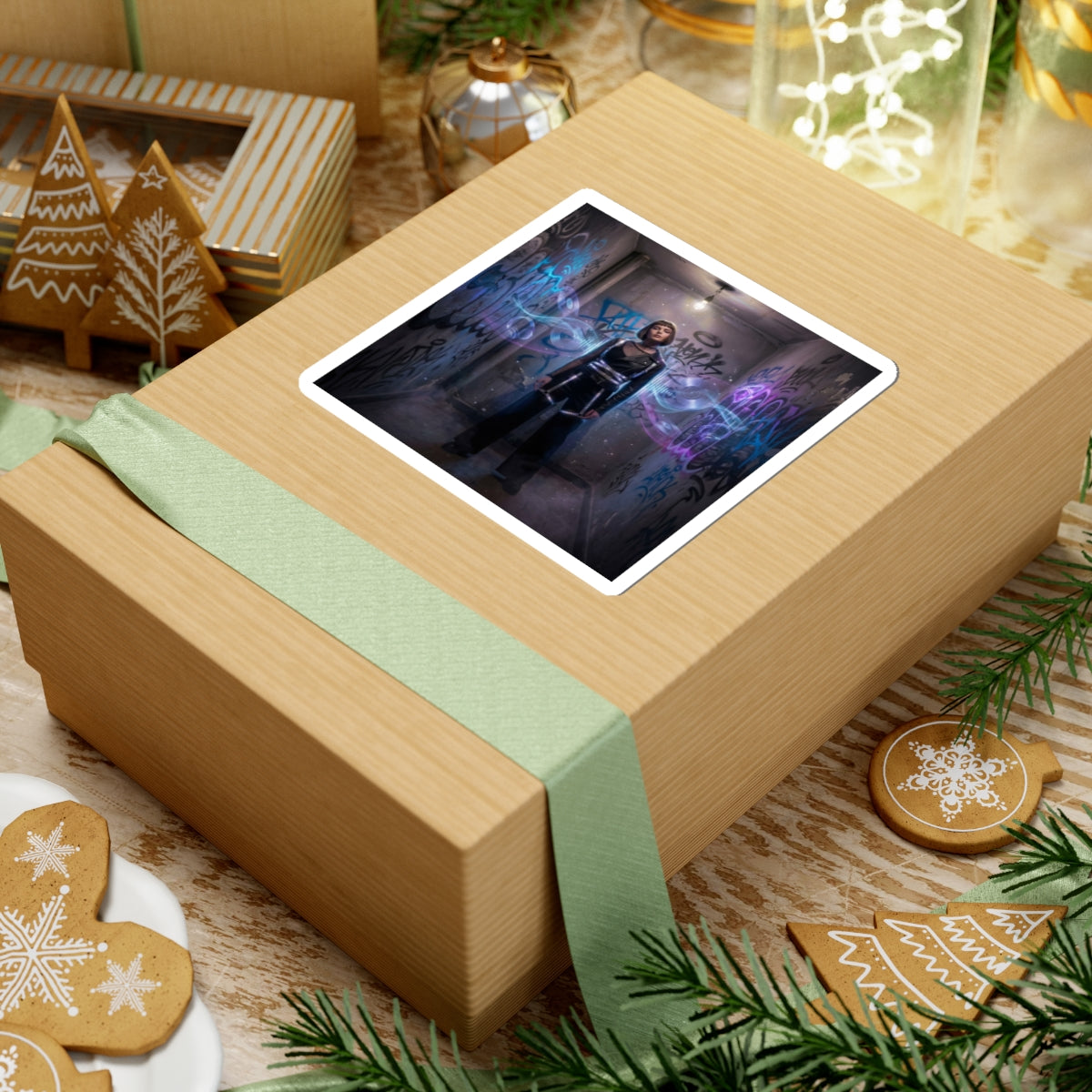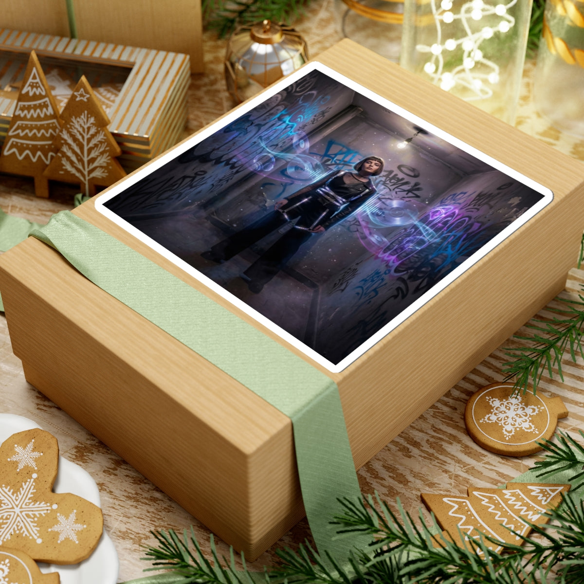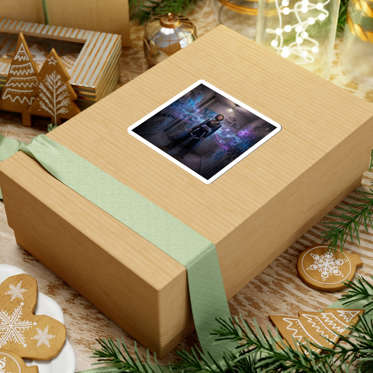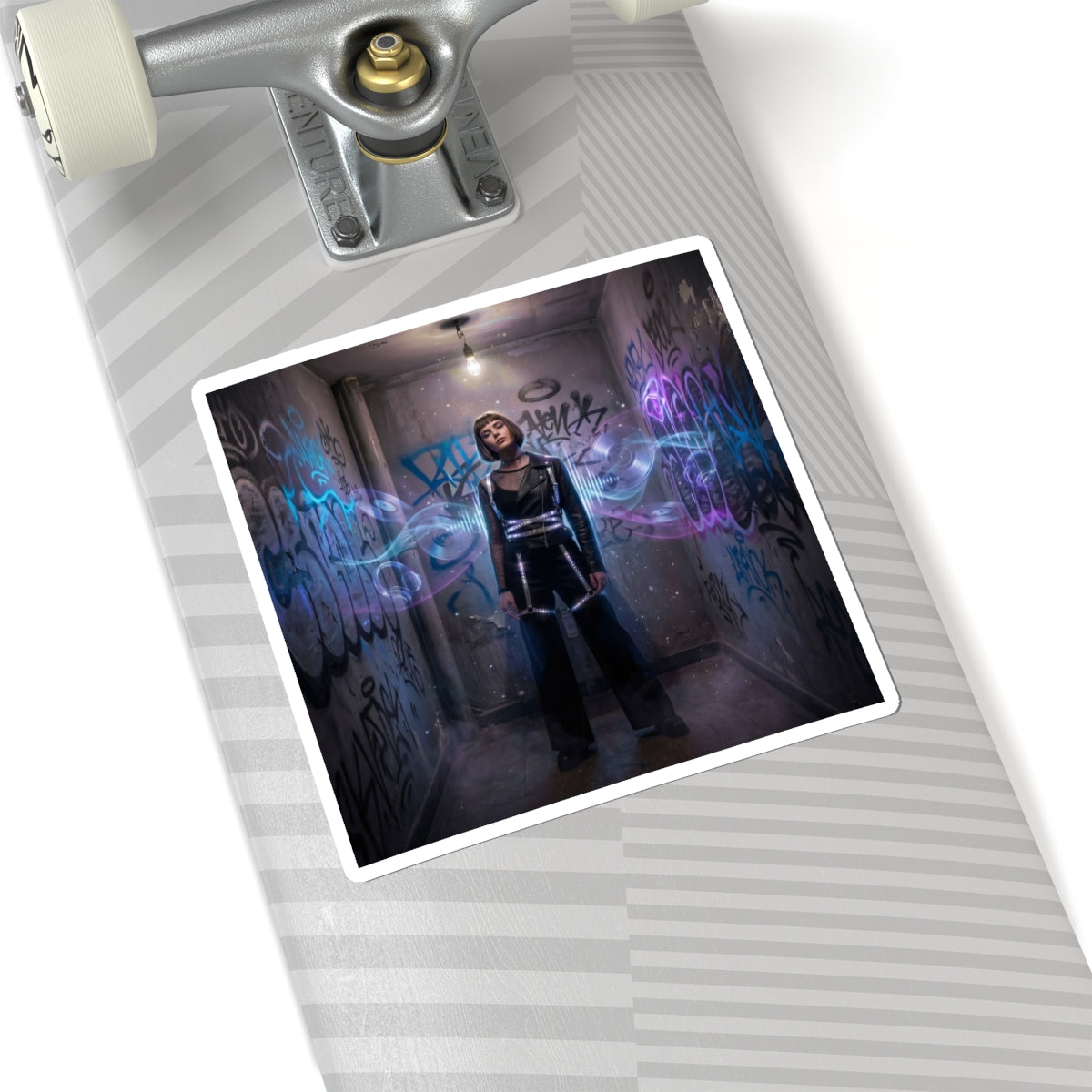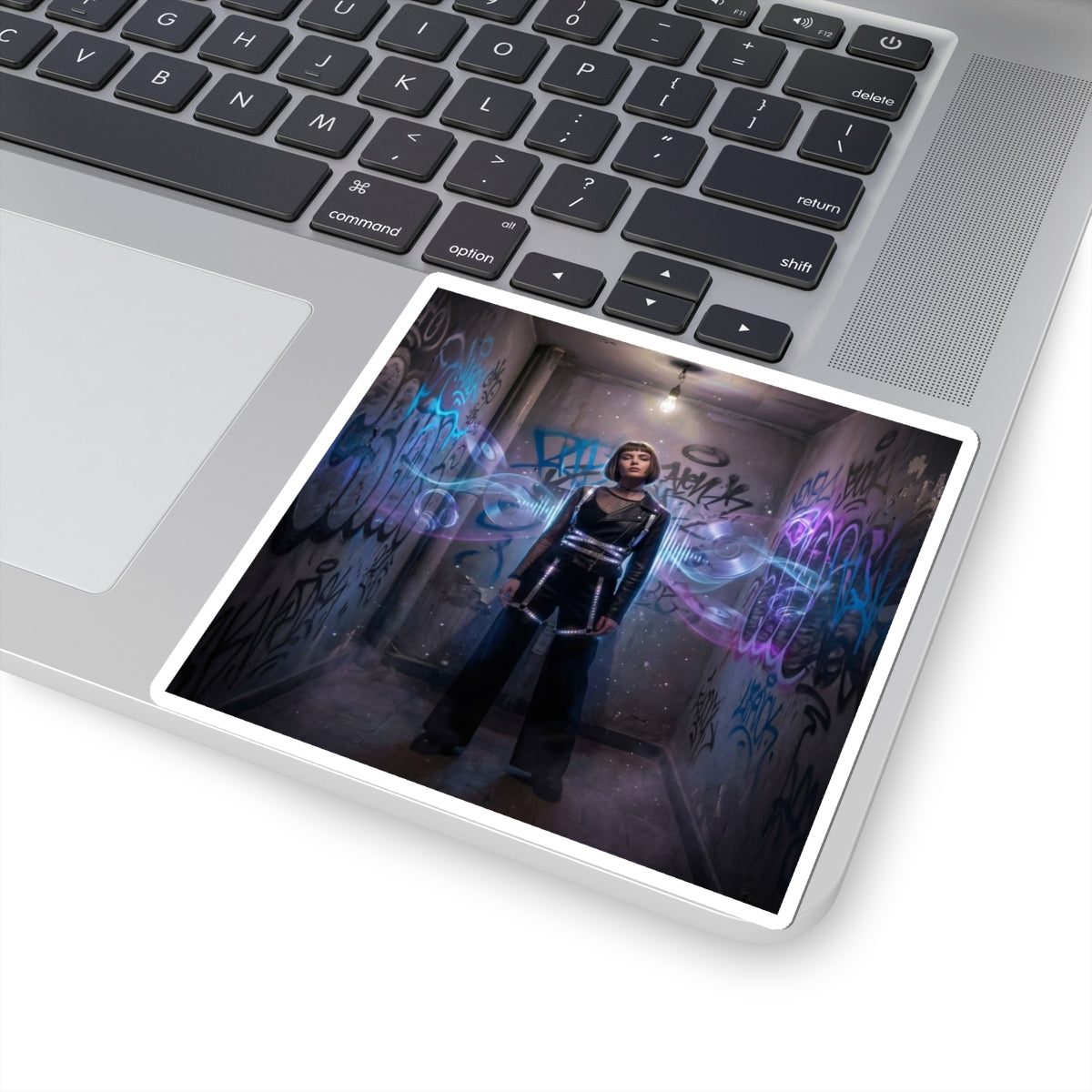A semi-realistic, edgy scene set in a graffiti-covered bathroom, walls layered with colorful tags, street art, and urban textures. In the center stands a confident woman dressed in techno-inspired fashion: sleek, black minimal clothing with bold silhouettes, mesh, leather, and avant-garde details. It clings smoothly to laptops, journals, water-bottle sleeves, and sketchbooks, bringing a subtle, mindful accent to everyday surfaces. The small, dark illustration reads like a personal reminder to find a little break during a busy day.