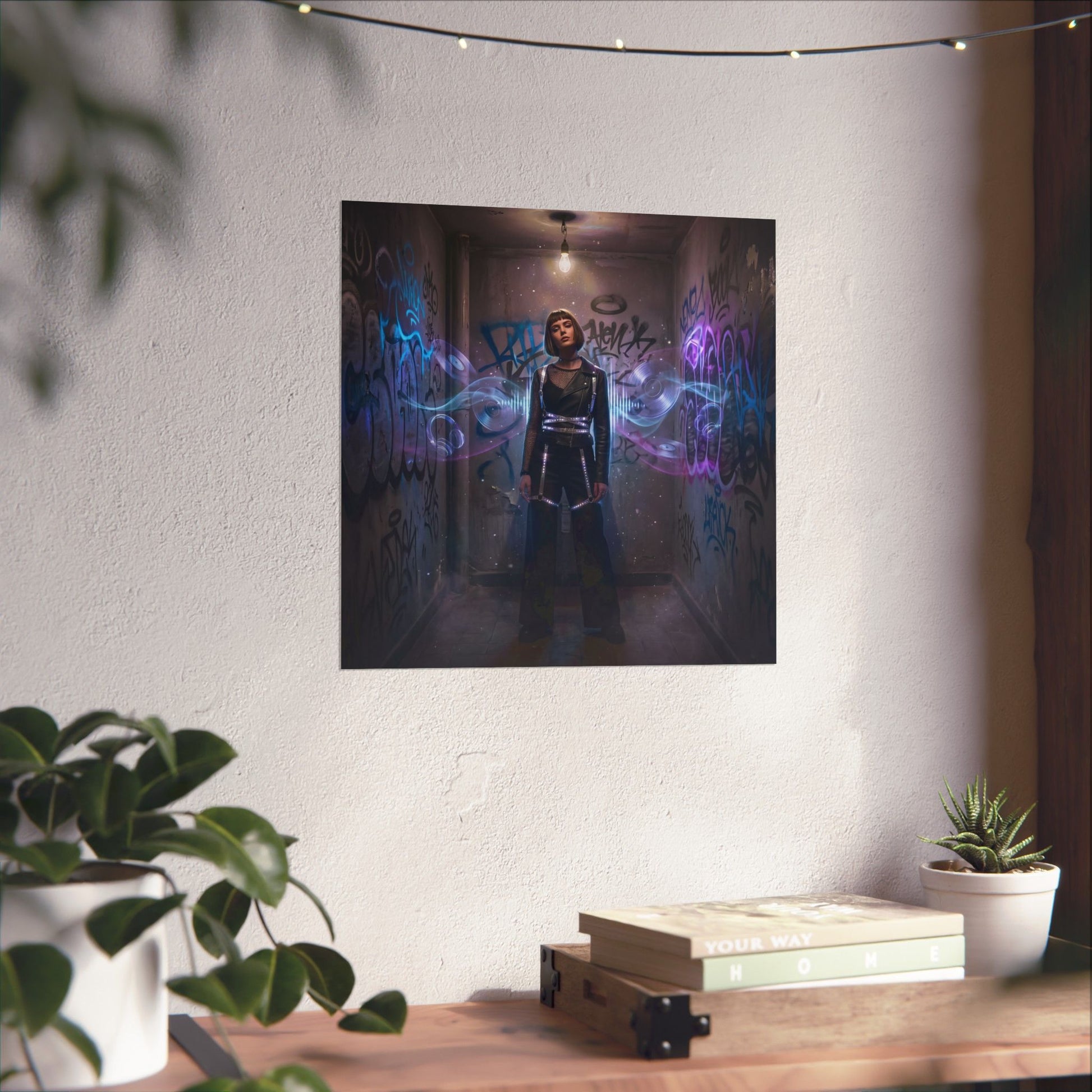 A semi-realistic, edgy scene set in a graffiti-covered bathroom, walls layered with colorful tags, street art, and urban textures. In the center stands a confident woman dressed in techno-inspired fashion: sleek, black minimal clothing with bold silhouettes, mesh, leather, and avant-garde details. Printed on museum-grade archival paper with giclée inks, the illustration’s subtle gradients and luminous hues stay true without glare thanks to the matte finish.