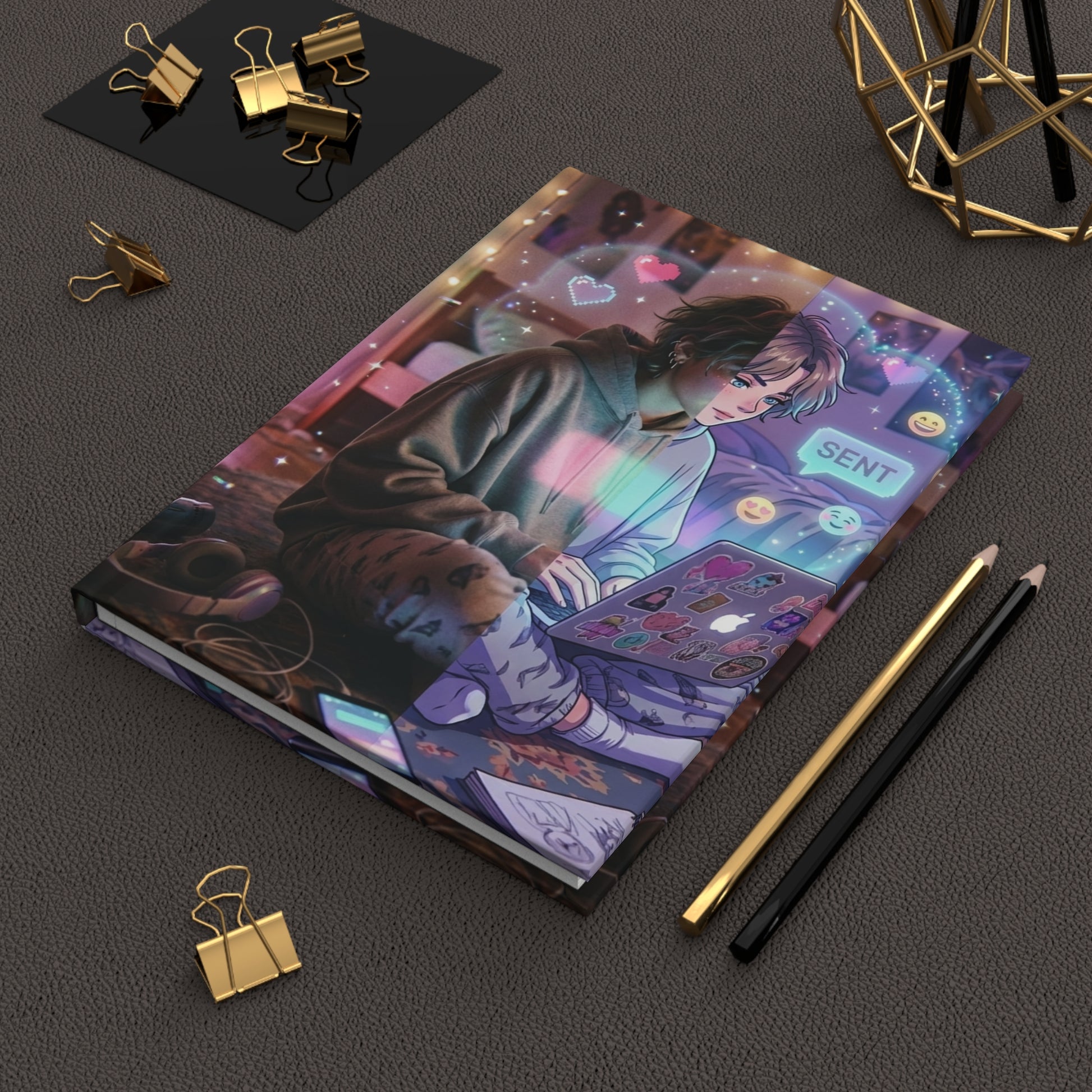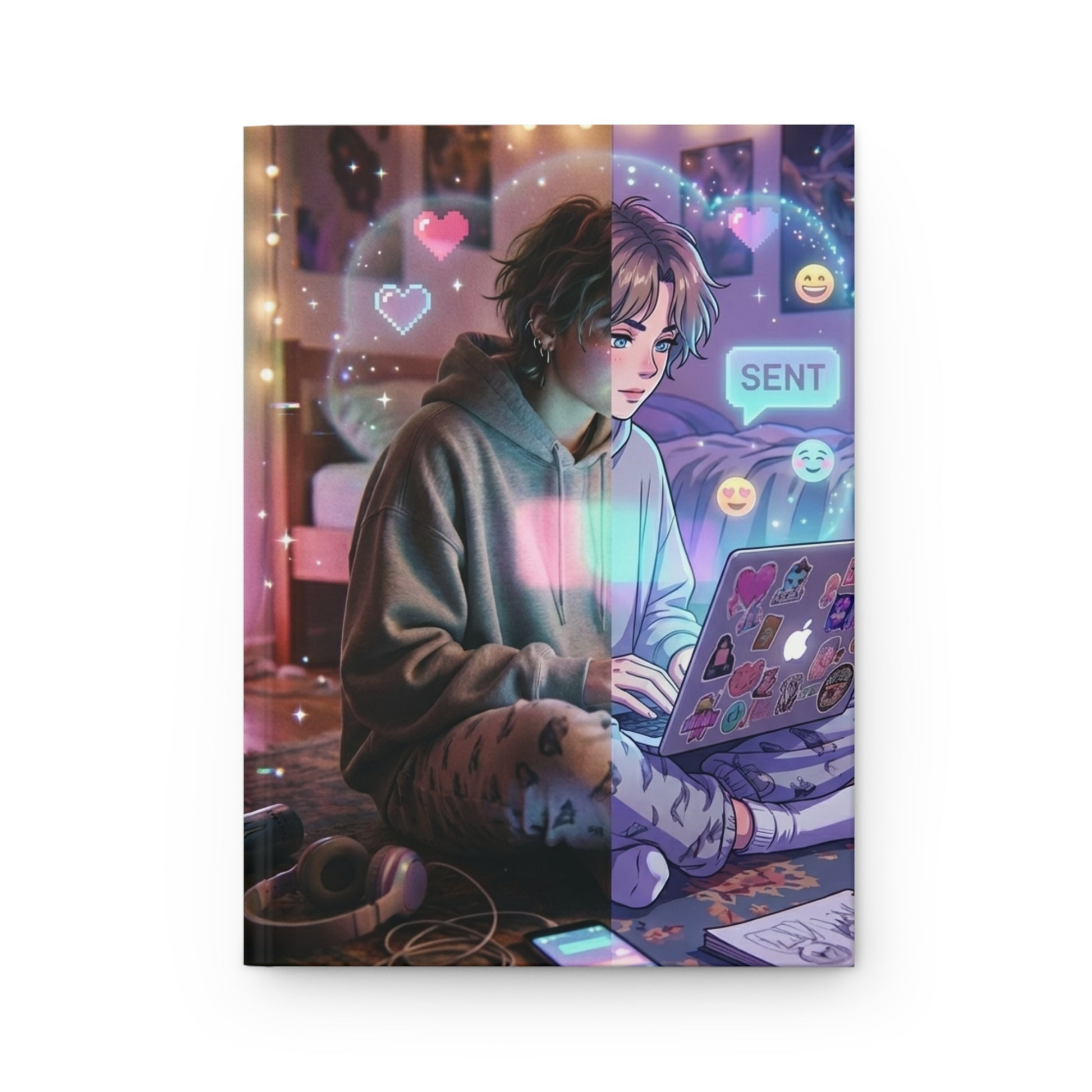 This hardcover journal wraps the digital vibe in a matte-finished cover that invites you to go into your surreal dreams. The full wraparound illustration shows a mood that feels intimate, creative, and emotionally expressive — like a late-night moment of internet culture, creativity, and connection. Rendered in the signature “Gibtly Vibe Surrealism” aesthetic, setting a contemplative mood before you even open it.