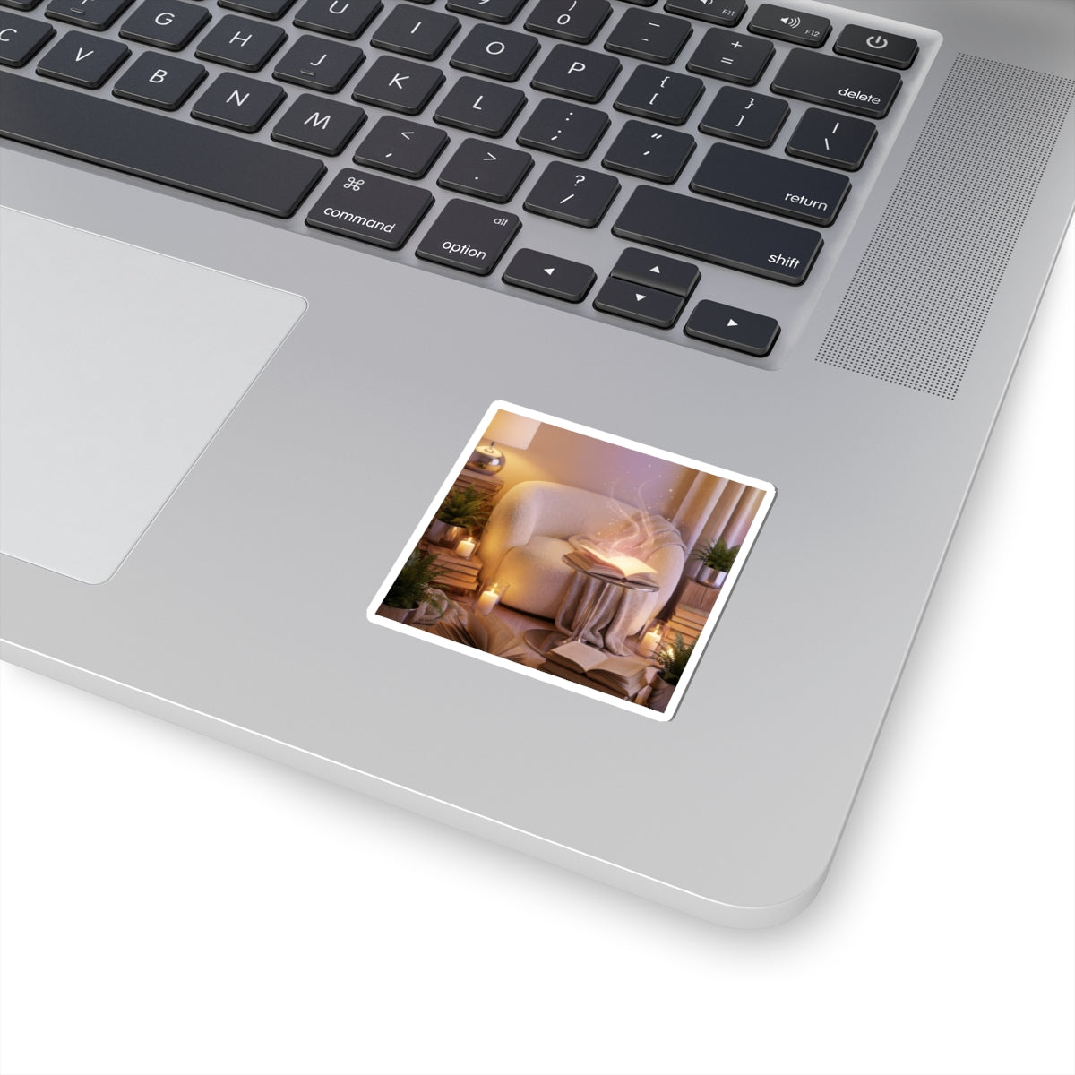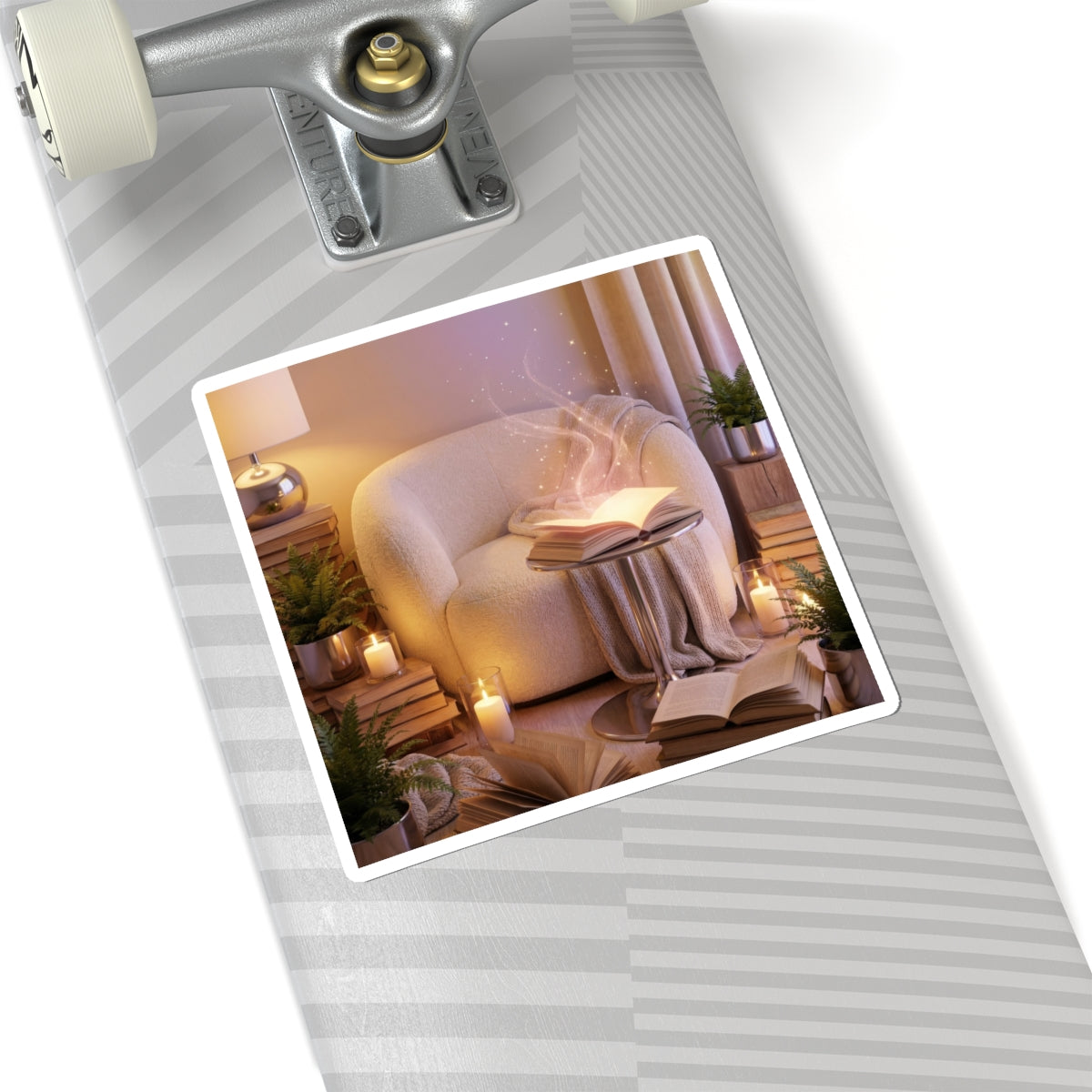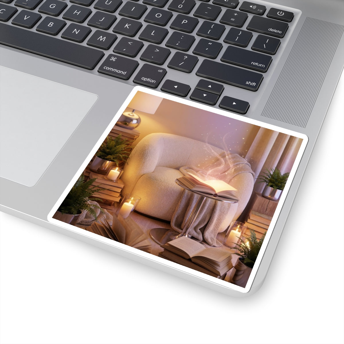 A semi-realistic cozy reading corner scene featuring a comfortable armchair surrounded by stacked books, soft blankets, glowing candles, and lush indoor plants. At the center, an open book gently radiates a soft magical glow, releasing delicate floating light particles and subtle shimmering sparks that drift upward like quiet imagination taking shape. It clings smoothly to laptops, journals, water-bottle sleeves, and sketchbooks, bringing a subtle, mindful accent to everyday surfaces. The small, serene illustration reads like a personal reminder to breathe, slow down, and find a little stillness during a busy day.
