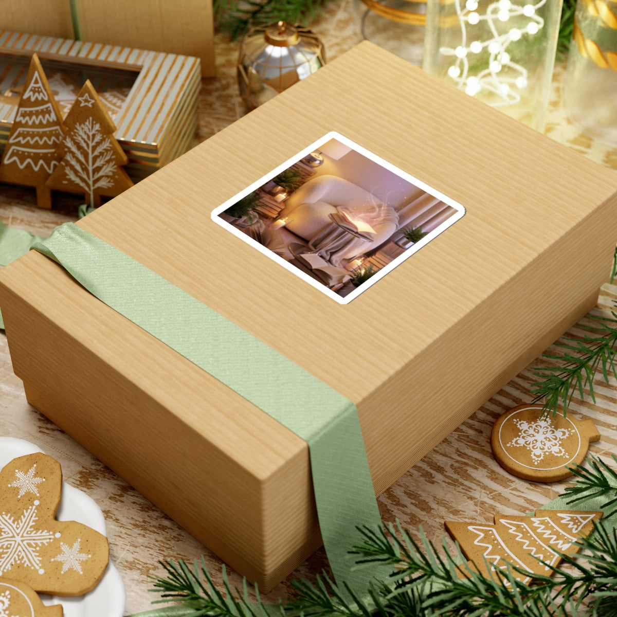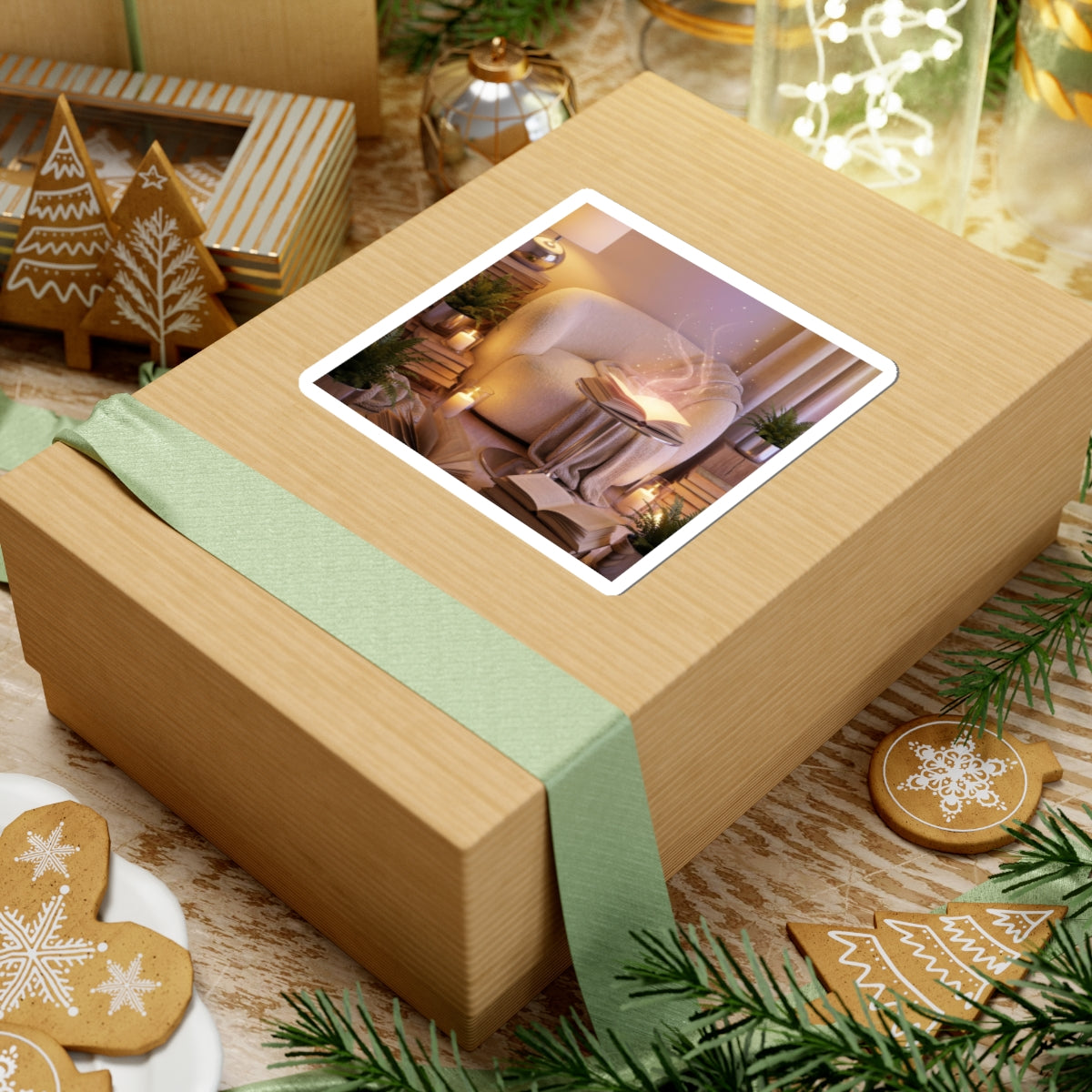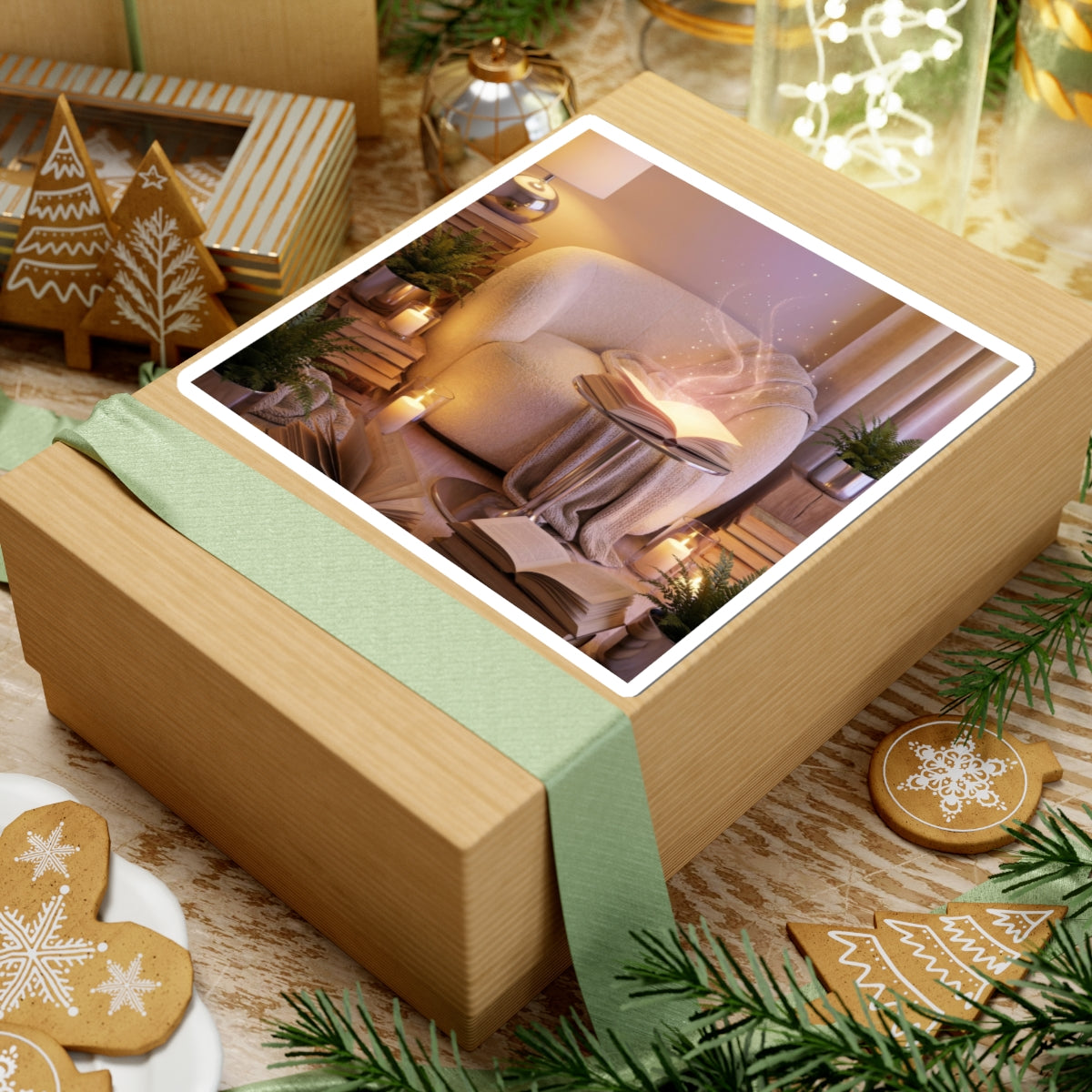 A semi-realistic cozy reading corner scene featuring a comfortable armchair surrounded by stacked books, soft blankets, glowing candles, and lush indoor plants. At the center, an open book gently radiates a soft magical glow, releasing delicate floating light particles and subtle shimmering sparks that drift upward like quiet imagination taking shape. It clings smoothly to laptops, journals, water-bottle sleeves, and sketchbooks, bringing a subtle, mindful accent to everyday surfaces. The small, serene illustration reads like a personal reminder to breathe, slow down, and find a little stillness during a busy day.