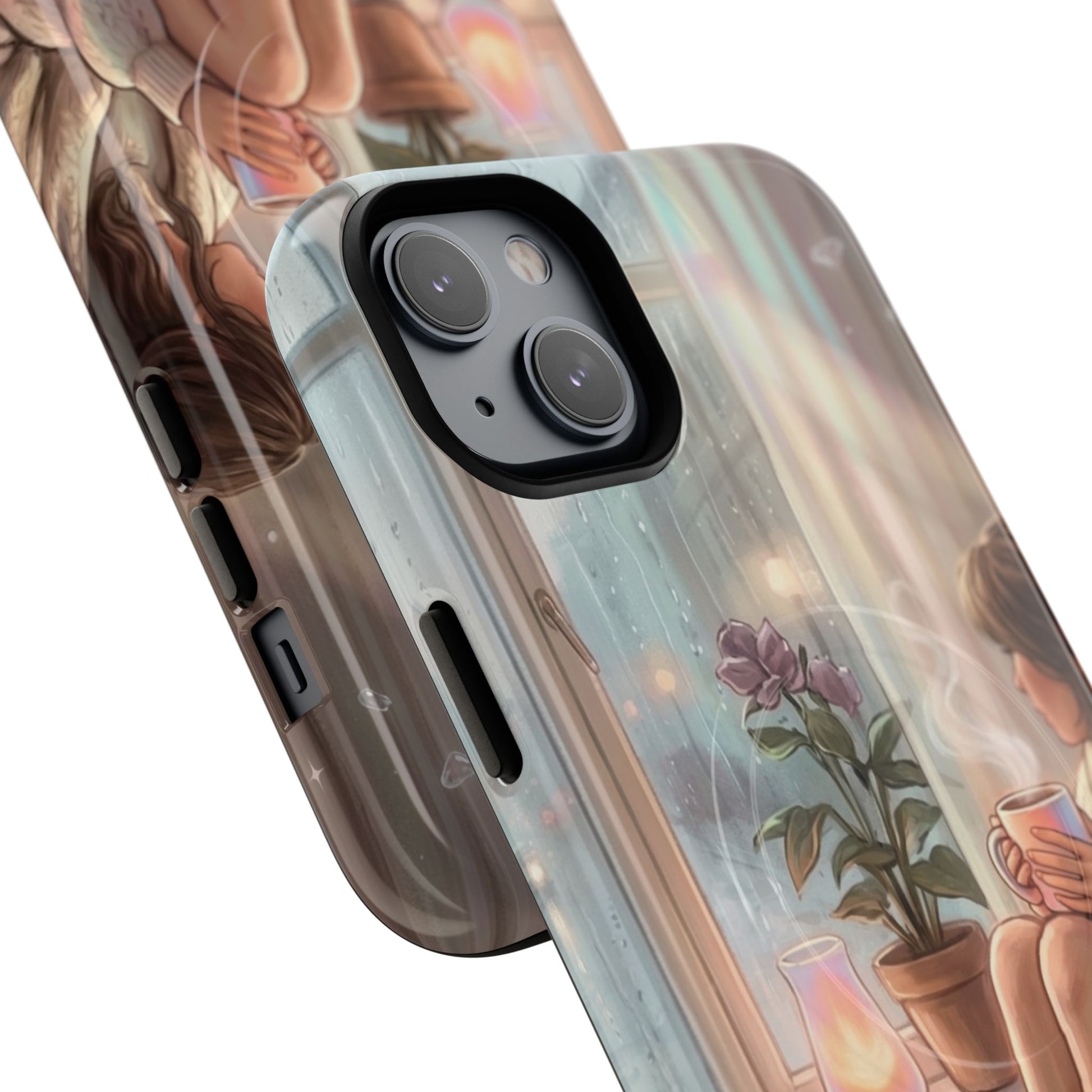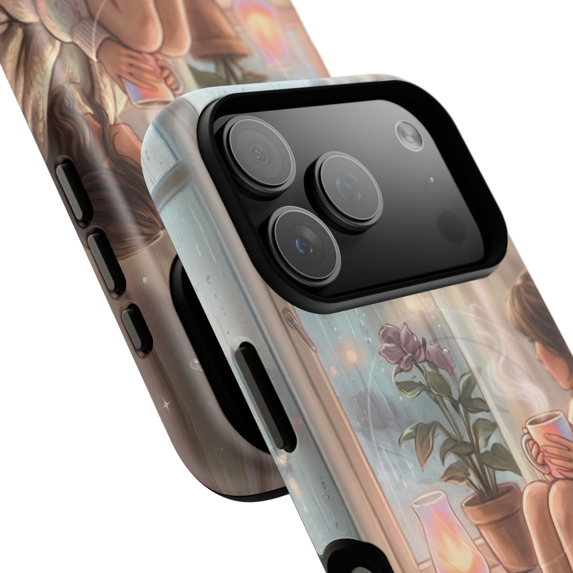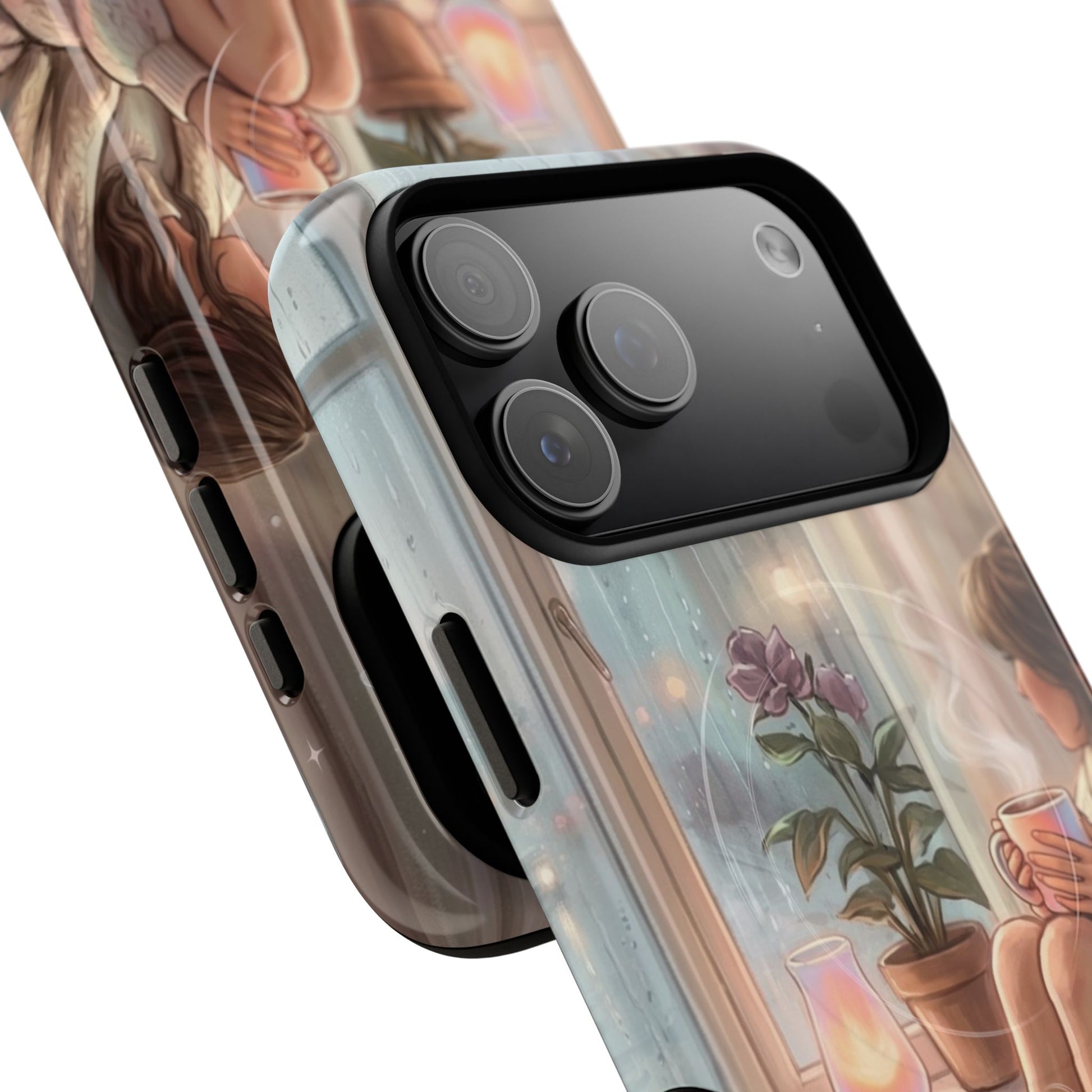 This slim, protective phone case wraps your device in a soft, dreamy scene — A serene, semi-realistic illustration of cozy interior scene of a person reading by a window on a rainy day. They hold a steaming cup of coffee, surrounded by soft blankets, lush indoor plants, and carefully layered textures. It’s the kind of case you notice when you reach for your phone; it slows you down for a moment and brings a little pause into a busy day. Built as a dual-layer shell with a tactile silicone liner, the case keeps your phone safe while the high-density 3D wrap preserves every brushstroke and gradient of the illustration. Whether carried to a coffeeshop, tucked into a tote on market day, or set beside a journal during a slow morning, this case adds a personal, artful touch to everyday life.