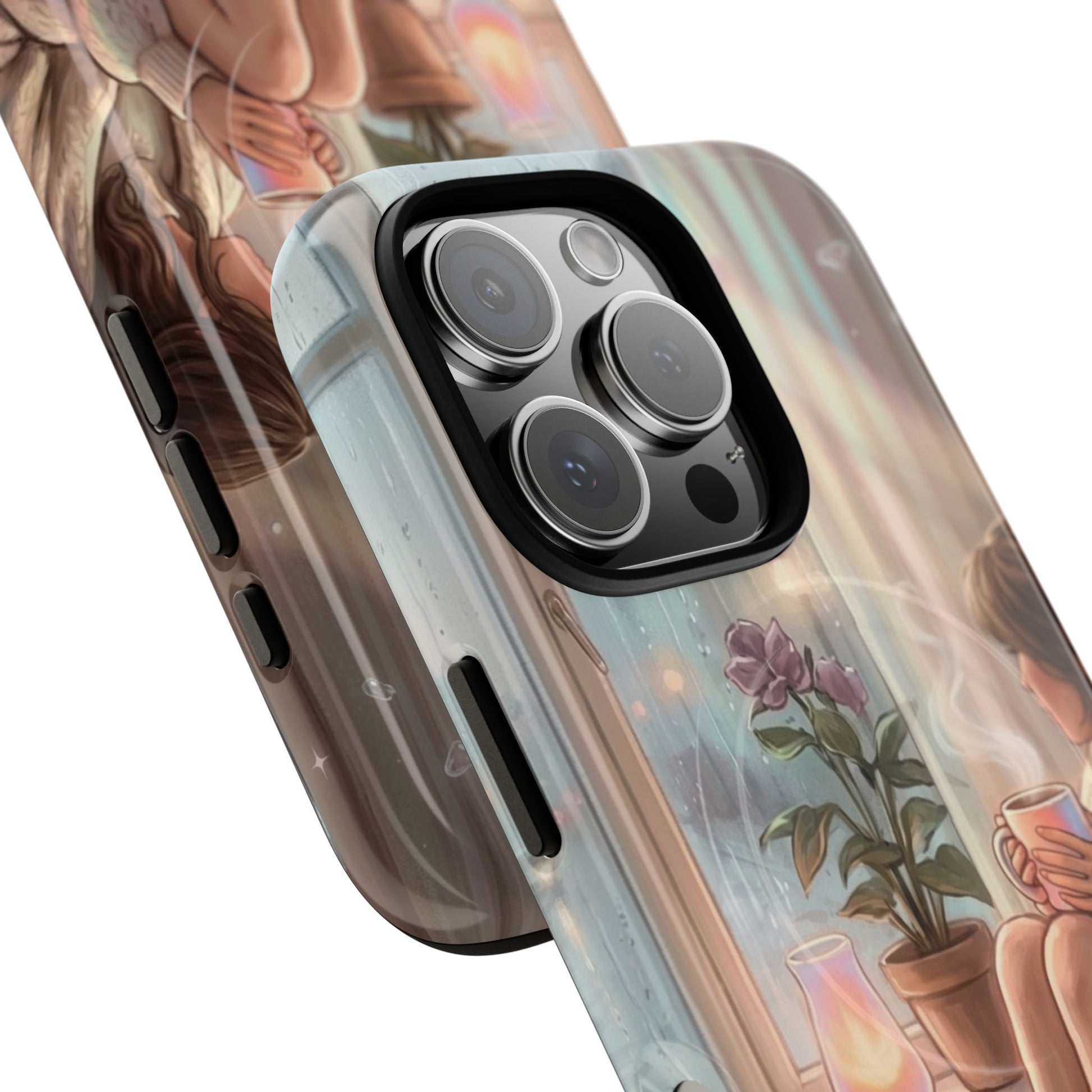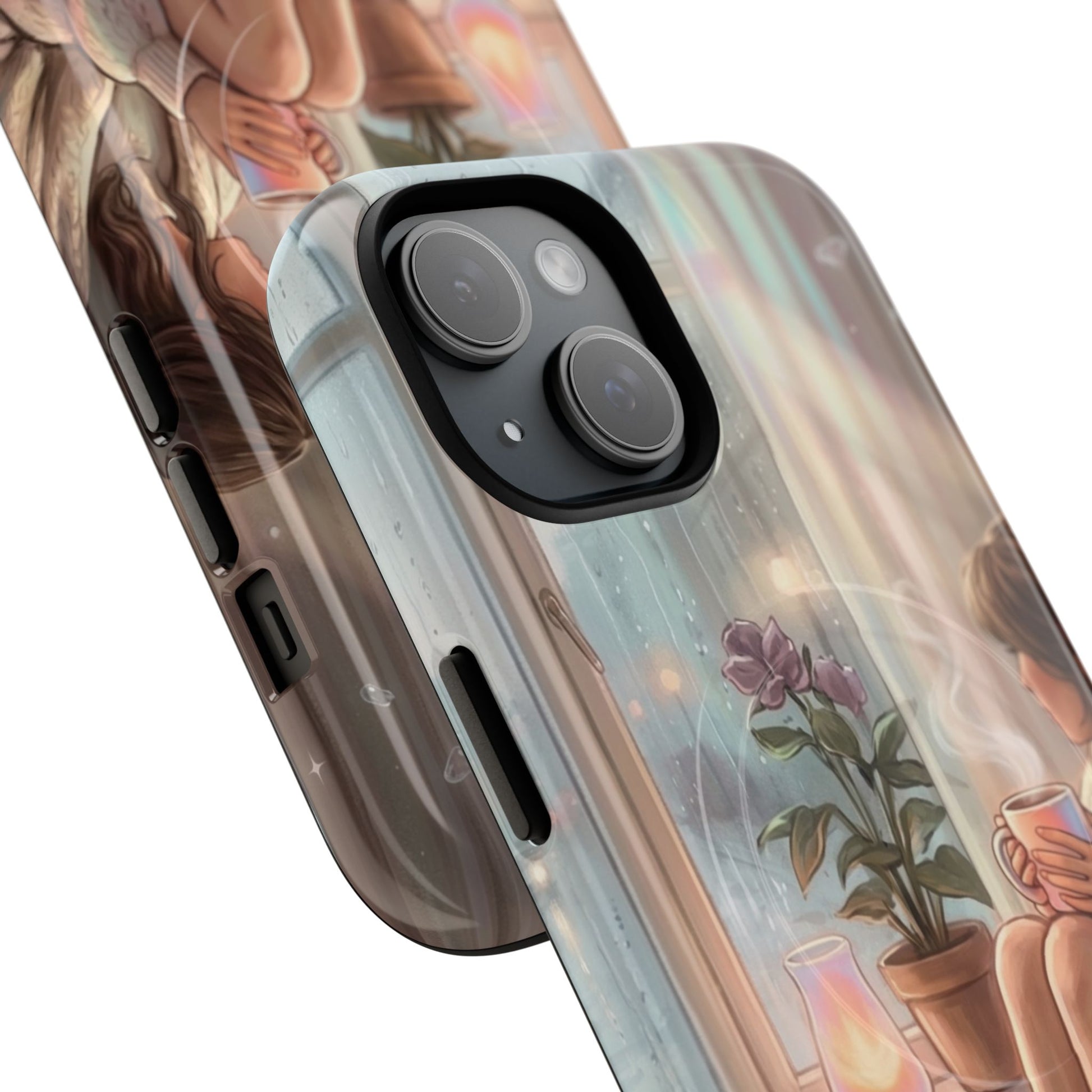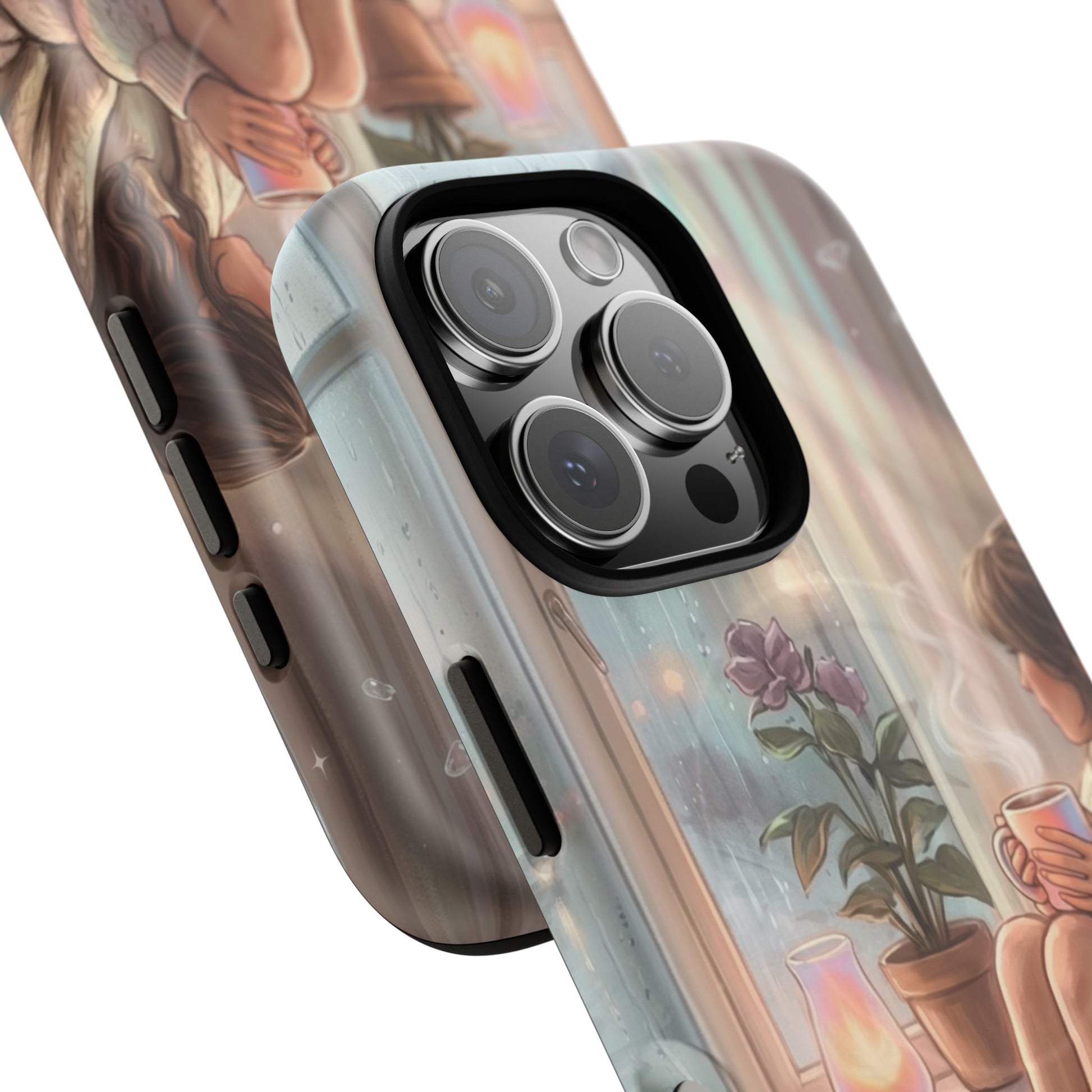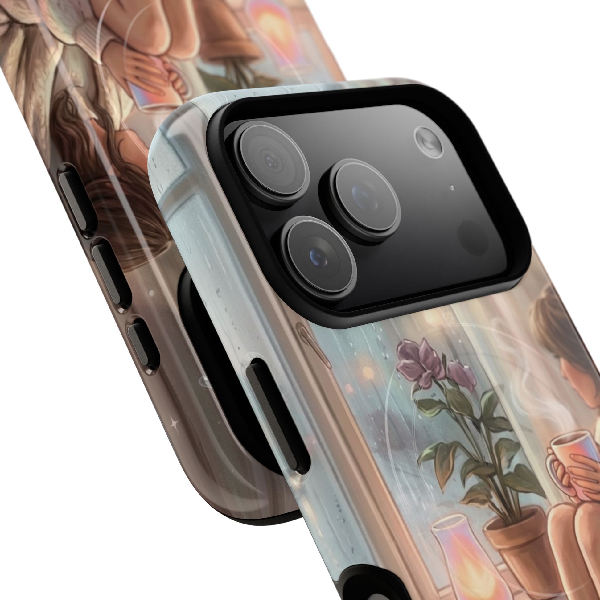 This slim, protective phone case wraps your device in a soft, dreamy scene — A serene, semi-realistic illustration of cozy interior scene of a person reading by a window on a rainy day. They hold a steaming cup of coffee, surrounded by soft blankets, lush indoor plants, and carefully layered textures. It’s the kind of case you notice when you reach for your phone; it slows you down for a moment and brings a little pause into a busy day. Built as a dual-layer shell with a tactile silicone liner, the case keeps your phone safe while the high-density 3D wrap preserves every brushstroke and gradient of the illustration. Whether carried to a coffeeshop, tucked into a tote on market day, or set beside a journal during a slow morning, this case adds a personal, artful touch to everyday life.