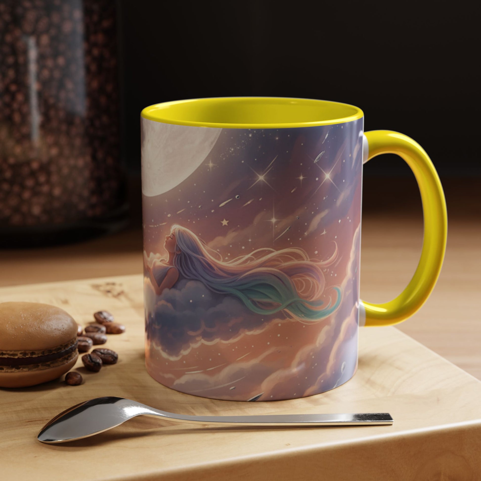 Subtle surreal elements: floating sparkles, gently glowing stars, and dreamy cloud formations: this ceramic mug holds a tiny pocket of calm. Illustrated with a sophisticated semi-realistic painterly textures, soft brushwork, and delicate lighting, the scene wraps around the cup like a secret galaxy. Sip slowly and feel the pastel skies, and gentle colors settle in. The black interior and handle add a crisp frame to the art, making each pause feel intentional. It’s for those who savor stillness with their coffee, tea, or cocoa — a small ritual object that nudges you back to peace between busy moments and makes slow mornings feel sacred.