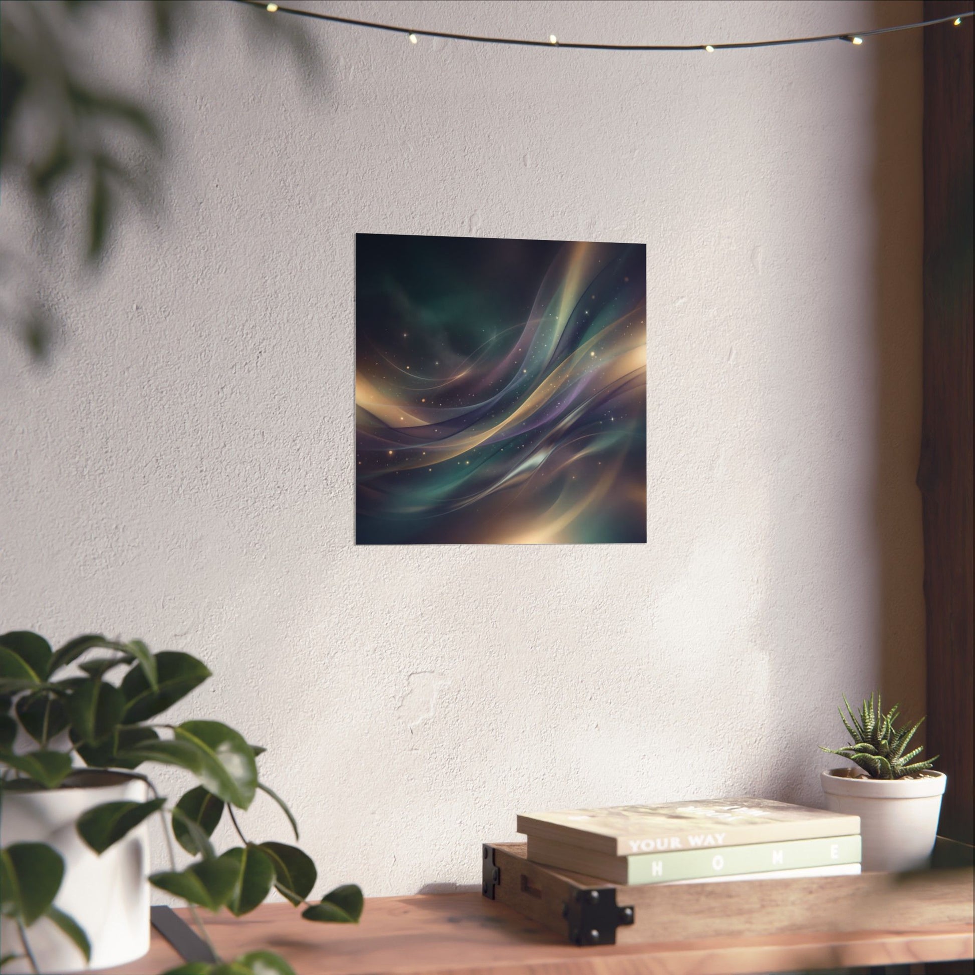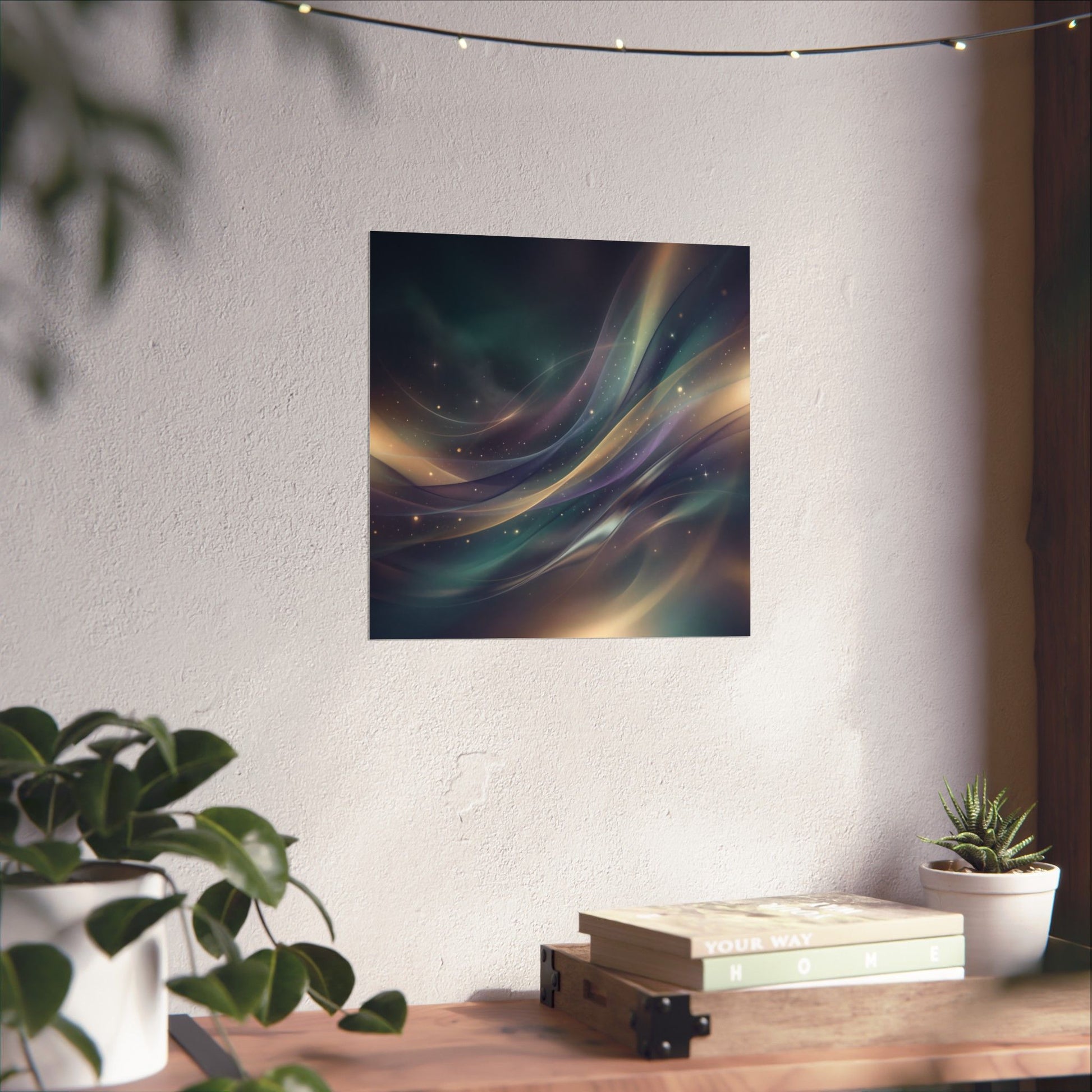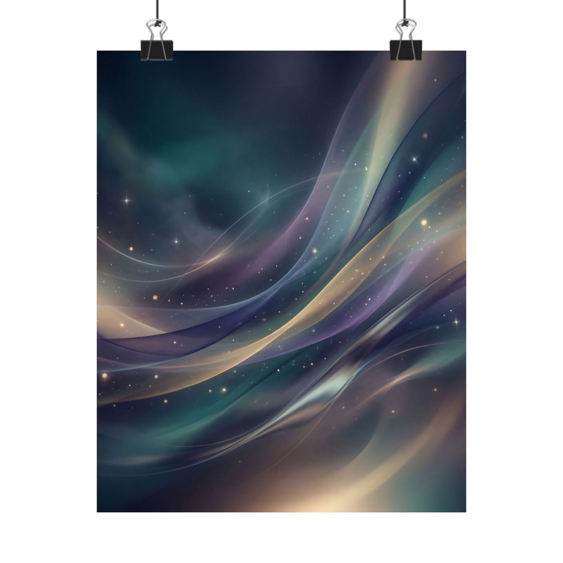 A realistic abstract composition made of flowing light beams, atmospheric gradients, and glowing particles forming a dreamlike environment. Layers of light move through space like music or emotion, creating an immersive sense of mood and atmosphere. Printed on museum-grade archival paper with giclée inks, the illustration’s subtle gradients and luminous hues stay true without glare thanks to the matte finish.