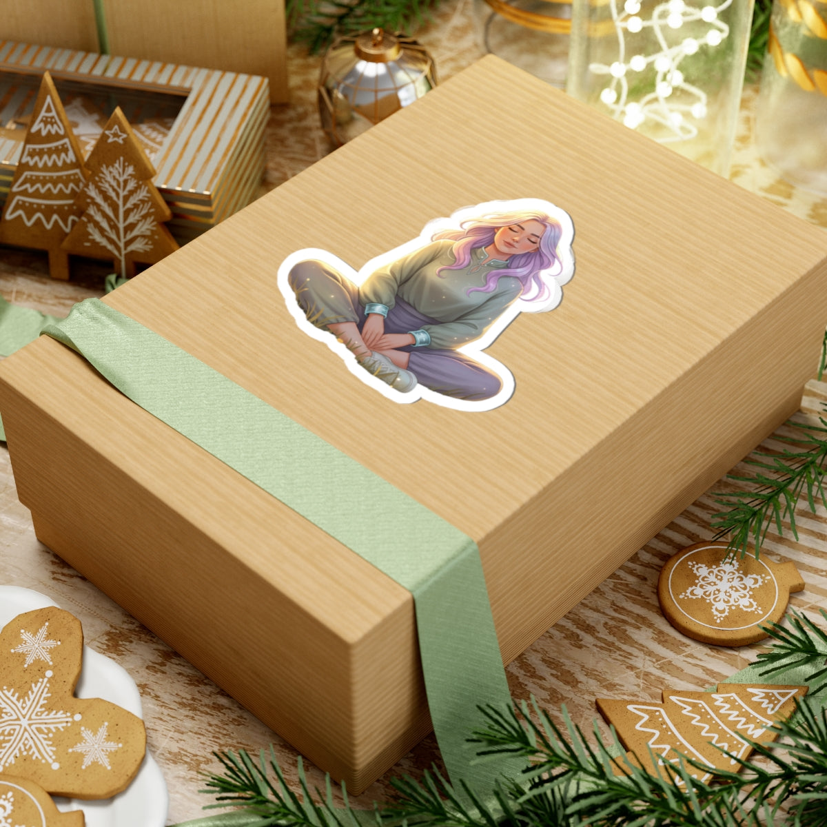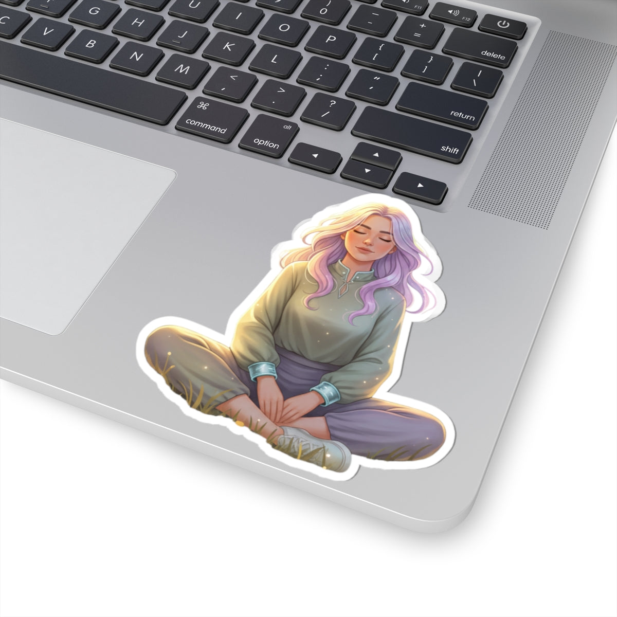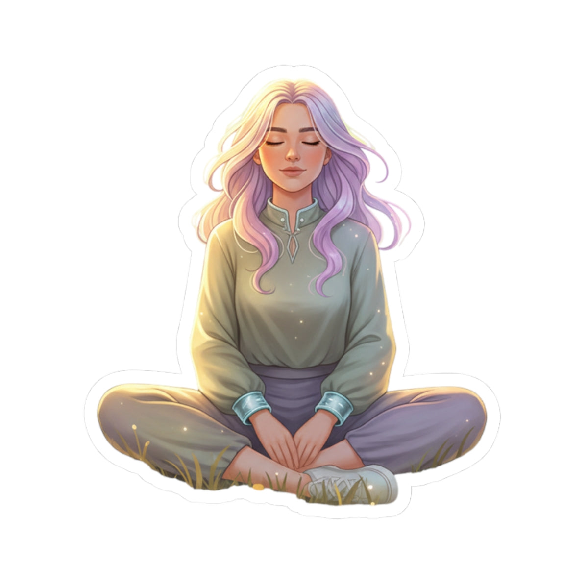 A quiet, soft sticker that carries a moment of calm wherever it goes. This glossy kiss-cut design features a seated figure in peaceful meditation — pastel hair catching the light, relaxed posture, and gentle shadows that lend depth and warmth. It clings smoothly to laptops, journals, water-bottle sleeves, and sketchbooks, bringing a subtle, mindful accent to everyday surfaces. The small, serene illustration reads like a personal reminder to breathe, slow down, and find a little stillness during a busy day.